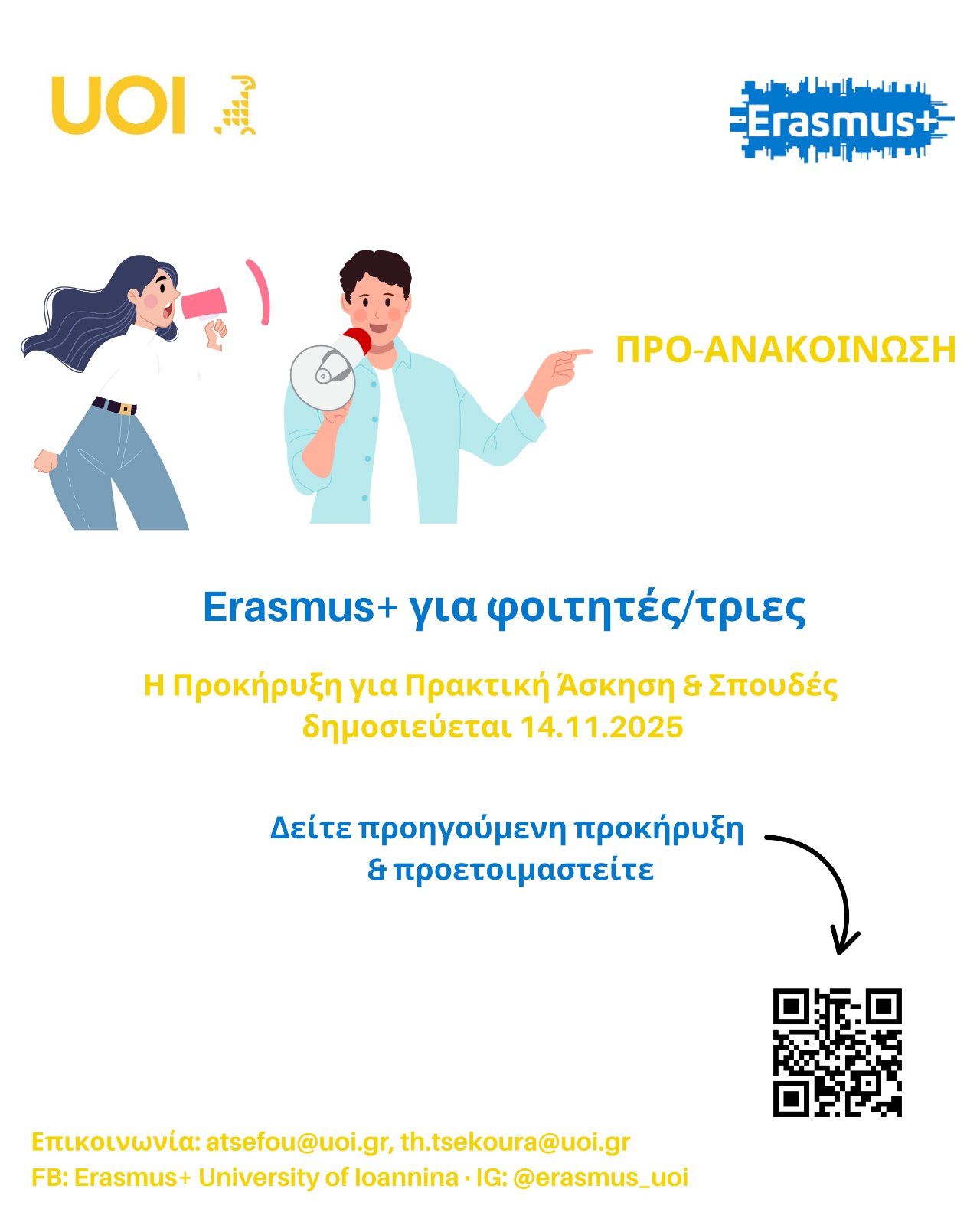 ΠΡΟ-ΑΝΑΚΟΙΝΩΣΗ για ERASMUS+ για φοιτητές/τριες