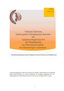 Η πολιτική διασφάλισης ποιότητας του Προπτυχιακού Προγράμματος Σπουδών του Τμήματος Μηχανικών Η/Υ & Πληροφορικής εναρμονίζεται με την πολιτική ποιότητας του Ιδρύματος. Έχει ως αντικείμενο την επιδίωξη ειδικών στόχων, σχετικών με τη διασφάλιση ποιότητας των προγραμμάτων σπουδών, τα οποία προσφέρει η ακαδημαϊκή μονάδα. Η παρούσα επικαιροποιημένη αναφορά της Πολιτικής Ποιότητας του Τμήματος παρουσιάστηκε στη Συνεδρίαση αριθμ. 462/17-05-2023 της Γενικής Συνέλευσης του Τμήματος Μηχανικών Η/Υ και Πληροφορικής του Πανεπιστημίου Ιωαννίνων, όπου και έγινε αποδεκτή από το Τμήμα.